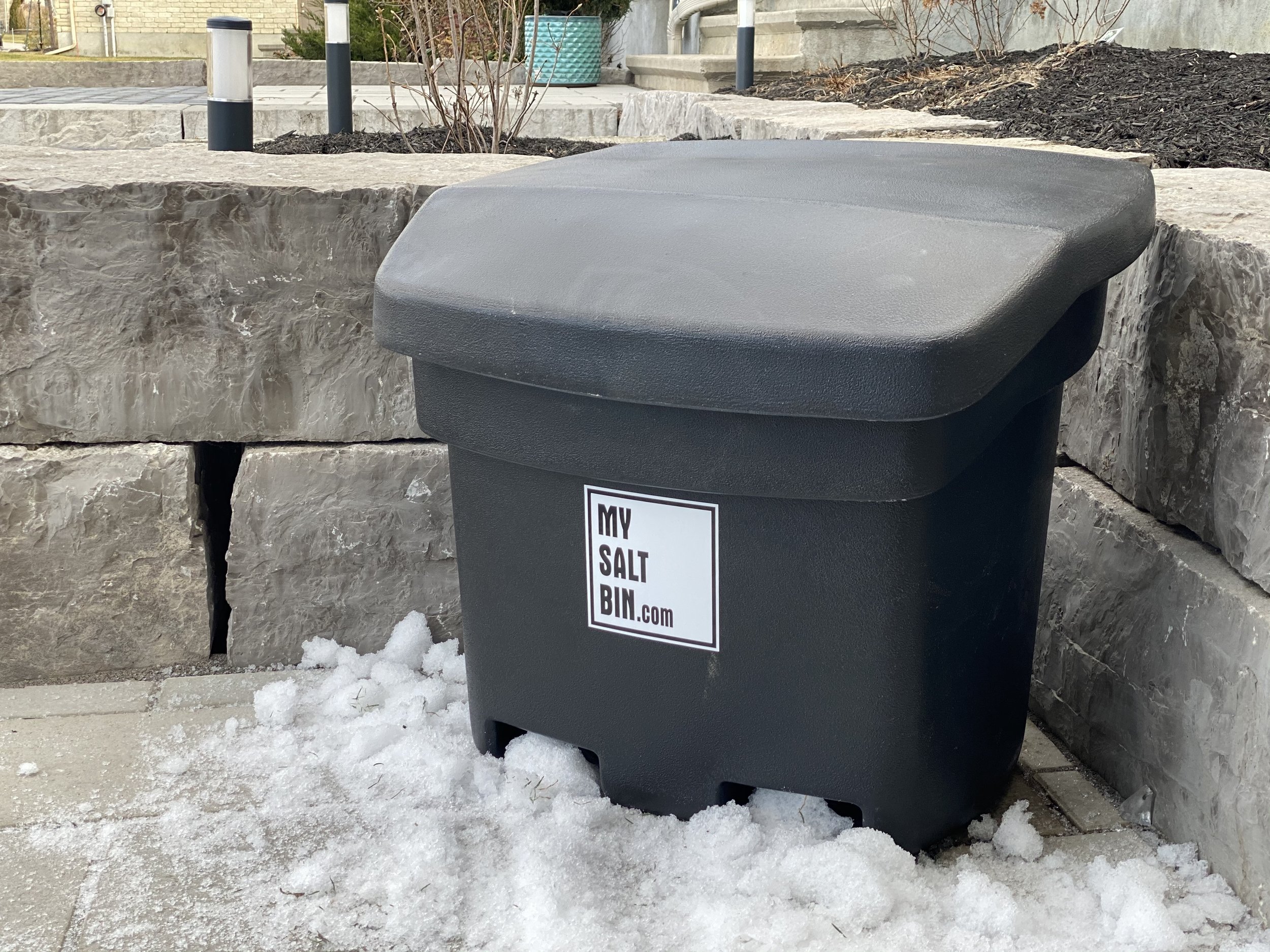 A full bin (160 kg) of premium ice melter that is pet-safe, eco-friendly, and interlock-friendly